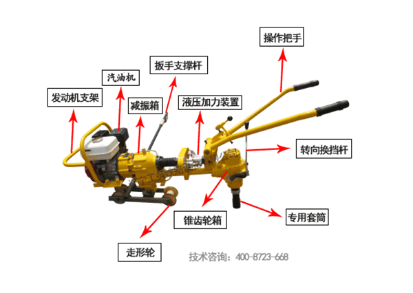 內(nèi)燃液壓螺栓扳手分為單頭螺栓扳手和雙頭螺栓扳手,今天向您介紹一款液壓?jiǎn)晤^螺栓扳手型號(hào) NLB-700,適用于鐵路、地鐵和輕軌線路上混凝土導(dǎo)軌枕頭螺母的松散工作。本機(jī)以汽油發(fā)動(dòng)機(jī)為動(dòng)力,輸出軸為單頭,單速正逆可調(diào),輸出扭矩可自由手調(diào)節(jié),并清楚地顯示整機(jī)操作方便,安全可靠,上下容易上路。