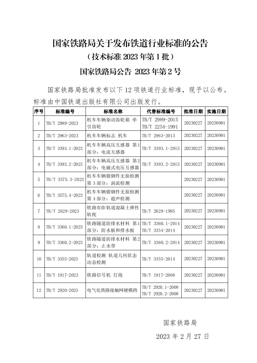 國家鐵路局關(guān)于發(fā)布鐵道行業(yè)標(biāo)準的公告(技術(shù)標(biāo)準2023年第1批)
